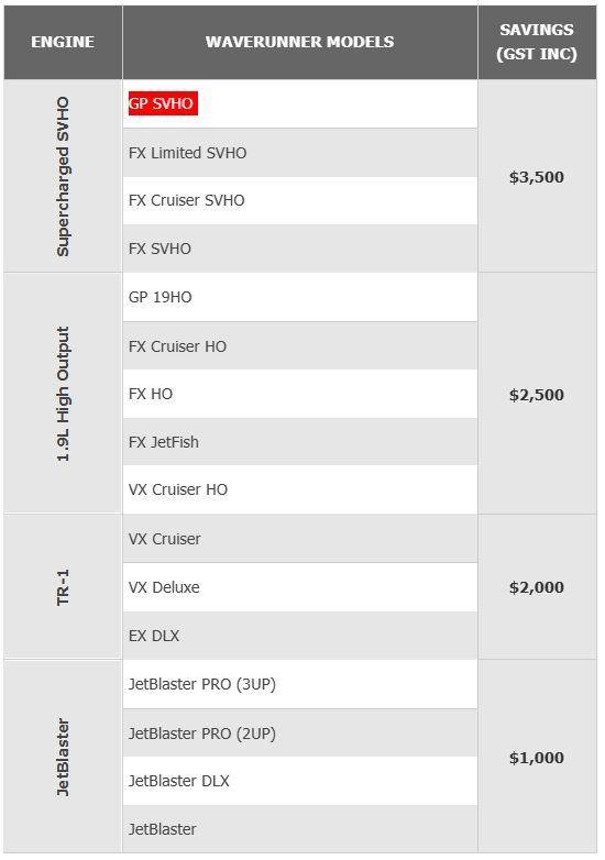 - 1.9L High Output Models: The sweet spot of performance and value. Models like the GP 19HO, FX Cruiser HO, FX HO, FX JetFish, and VX Cruiser HO offer exhilarating rides with substantial savings.